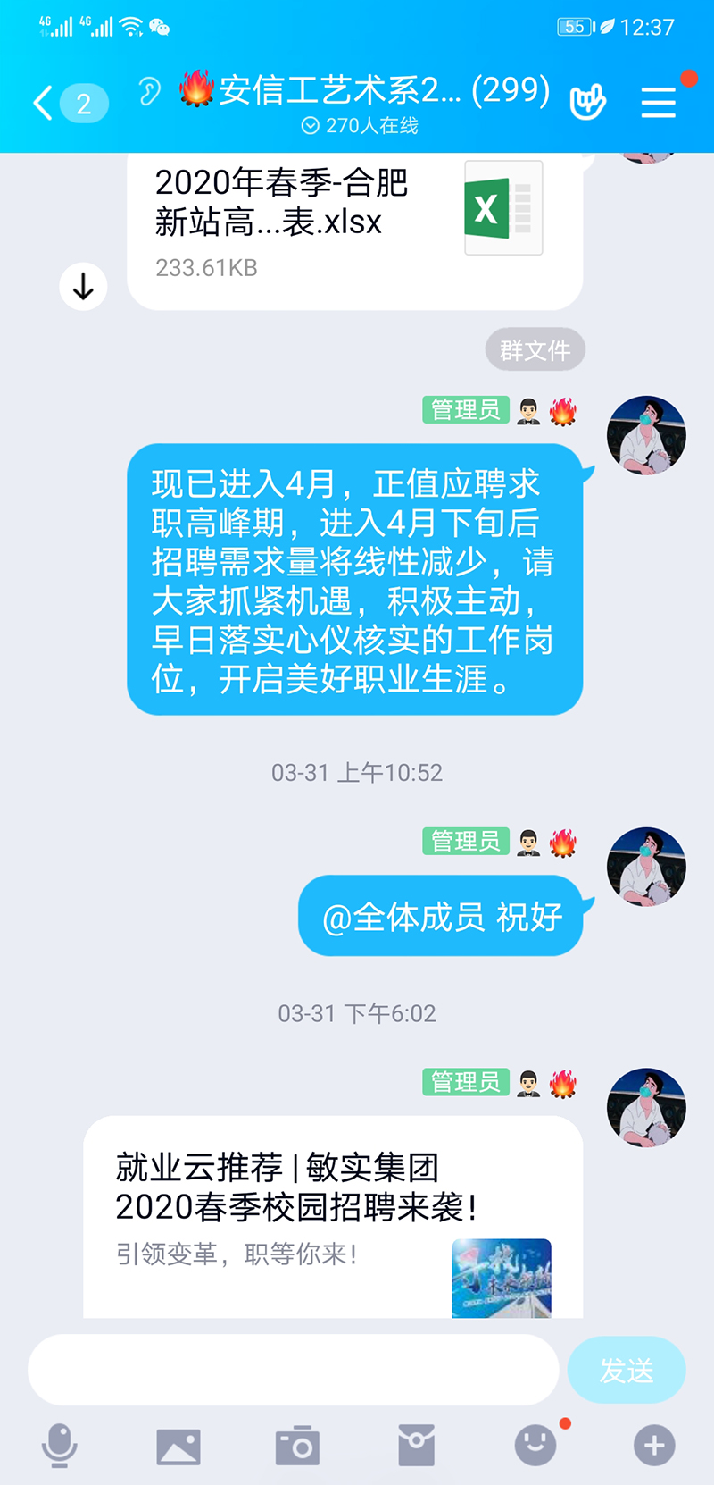 2020年4月,为落实教育部、安徽省关于做好新冠肺炎疫情防控期间毕业生就业工作的各项工作要求,安徽信息工程学院艺术设计学院快速行动,科学谋划,创新工作手段,运用网络载体认真做好疫情防控期间的就业服务工作,做到工作开展有“速度”、线上招聘“不停歇”、指导教育“不断线”、重点群体帮扶“心连心”,切实保障毕业生的身体健康和就业权益,最大限度地降低疫情对毕业生就业工作的影响。