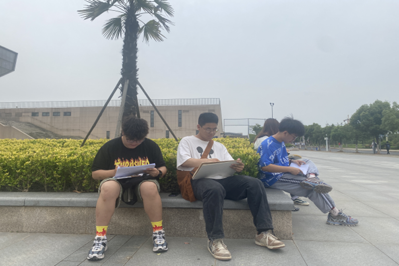 (图为学生在校内区域现场绘制图纸)
