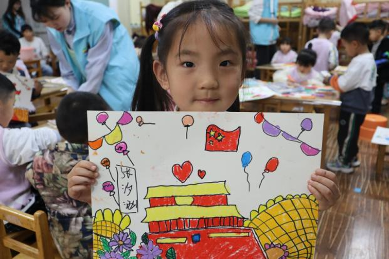 最后,志愿者们带领小朋友们用一笔一画描绘他们眼中的祖国,或勾勒出鲜艳的五星红旗,或画出雄伟的天安门,认真的脸庞、真挚的眼神都透露着他们对祖国的热爱、对未来的美好憧憬,通过小画笔传递着大情怀。