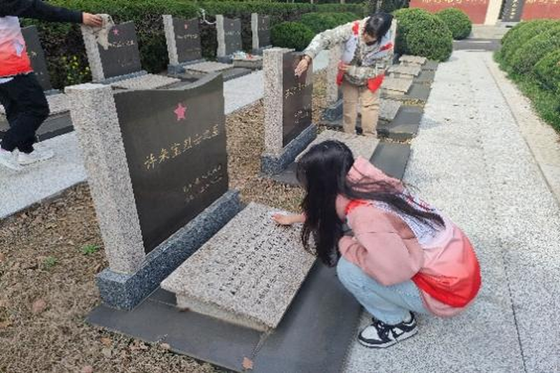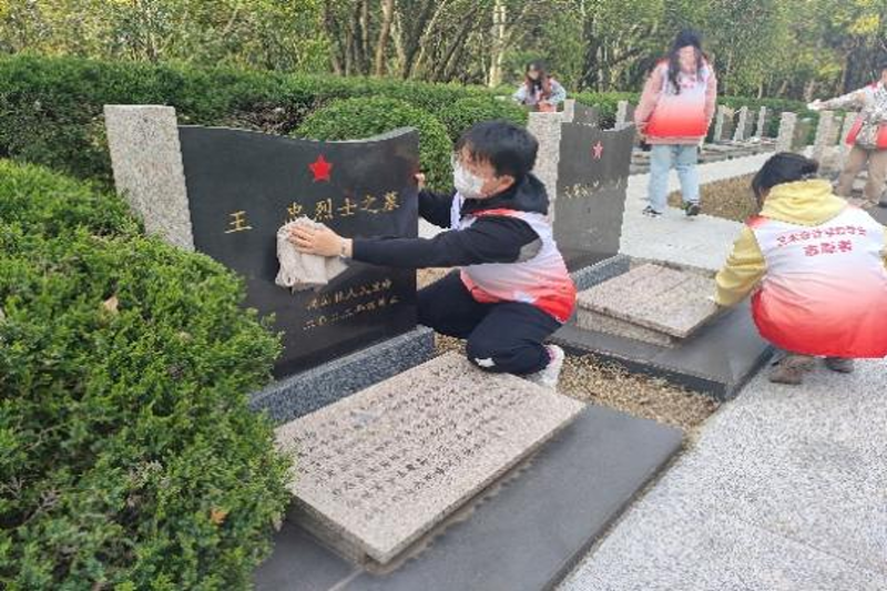 (志愿者擦拭英雄墓碑、清扫周边路面)