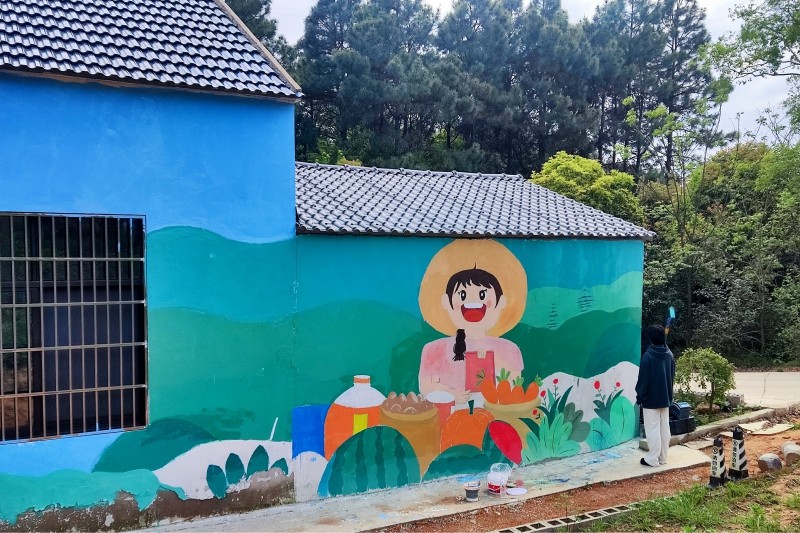 新丰村位于湾沚区,是一个充满田园风光的小村庄。为了迎接即将到来的马拉松赛事,提升赛道周边的环境,当地村委会决定邀请艺术设计学院的学生团队为村庄进行墙绘装饰。在胡亚男老师的带领下,学生们积极响应,用他们的创意和热情,将一面面普通的墙壁变成了一幅幅精彩的画作。4月10日,新丰村的墙绘项目迎来了圆满的完成,学生团队到达新丰村,为墙绘刷上最后一层保护漆。