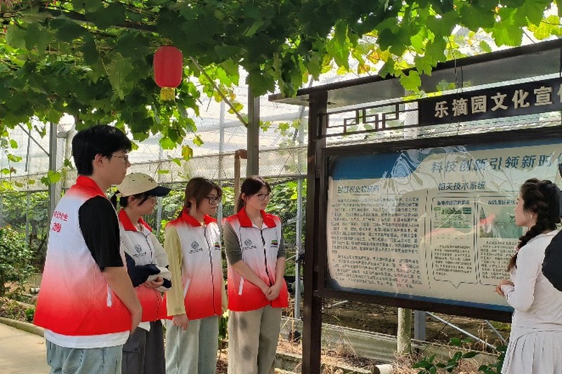 (向导为志愿者介绍采摘园与葡萄)