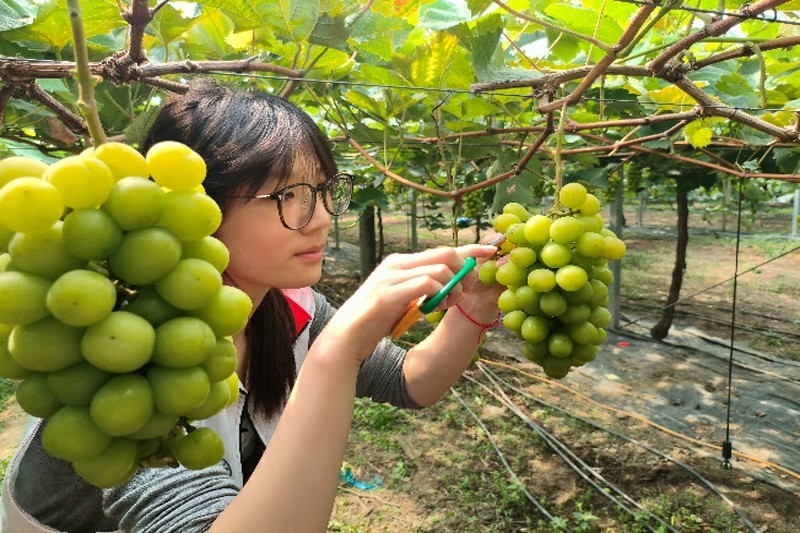 (志愿者尝试采摘葡萄)