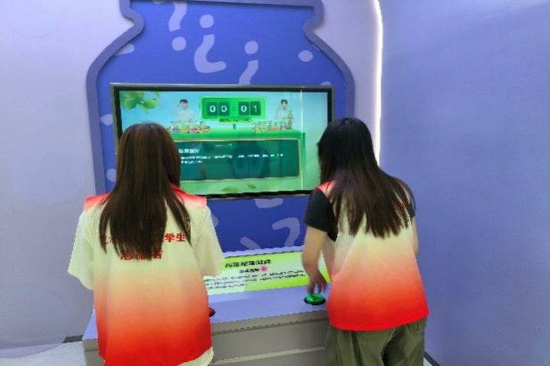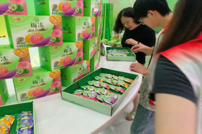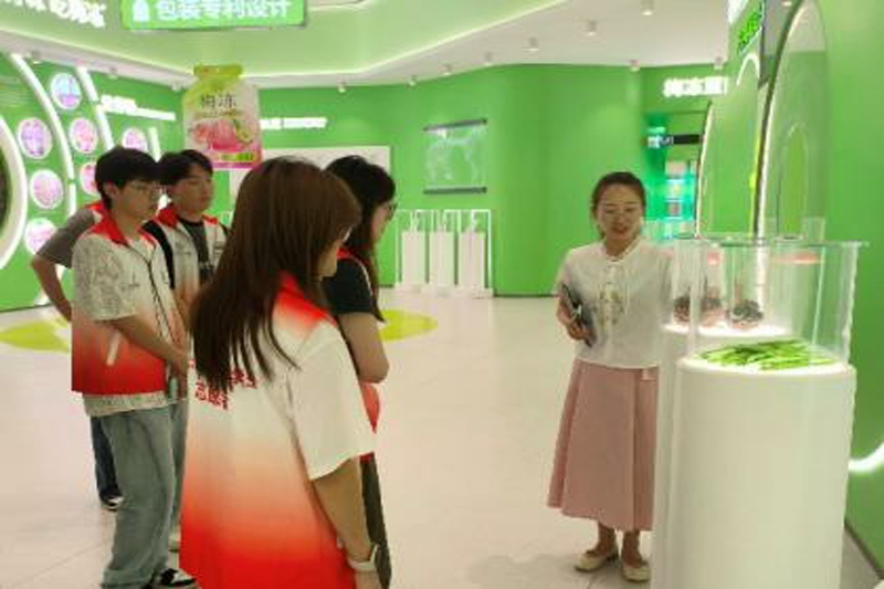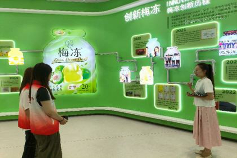 临近尾声,志愿者们来到了品牌馆的互动体验区。整齐又富有设计感的样品展示区映入眼帘,志愿者们不禁发出赞叹的声音。讲解员热情邀请志愿者体验互动项目。志愿者们积极实践,在趣味互动中进一步加深了对于梅冻产品的了解,体会食品加工产业中的种种乐趣与惊喜,实际感受到了溜溜果园在天然梅冻生产领域的专业水准与创新精神。