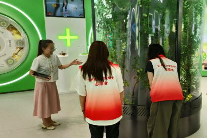 随后,讲解员带领志愿者们观摩了“梅冻”产品的原料展览。志愿者们参观了原料展厅,亲眼观摩了食品原料的生长情况,感受原料的纯天然特征。来到成分展览区域后,讲解员仔细介绍了梅冻选料的优势特征与其独一无二的工艺流程,展现梅冻所具有的严选性、天然性与创新性。在聆听讲解时,志愿者们对原料展览充满好奇,仔细观察原料的外貌特征,认真阅读展览介绍,感受农产品加工工艺的魅力。