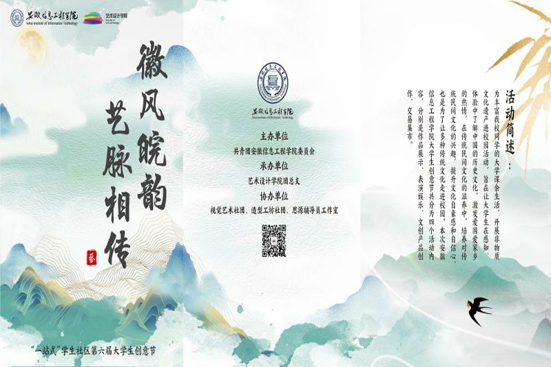 本次大学生创意节以“徽风皖韵,艺脉相传”为主题,旨在通过丰富多彩的活动,让在校大学生深入感知和体验中国历史文化,激发爱国爱家乡的热情,同时培养对传统民间文化的兴趣,提升文化自豪感和自信心。活动内容包括作品展示、文艺演出、徽州非遗体验以及创意集市四大模块,将全方位展示大学生的创意才华和对传统文化的热爱。
