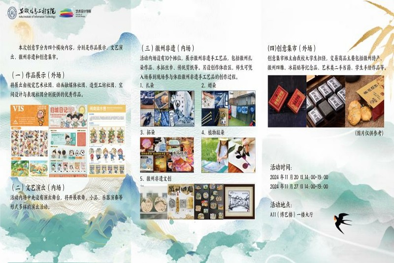 安徽信息工程学院即将迎来一场文化与创意的盛宴——第六届大学生创意节。本次创意节由共青团安徽信息工程学院委员会主办,艺术设计学院团总支承办,视觉艺术社团、造型工坊社团、思源辅导员工作室协办,活动将于11月20日和11月27日陆续呈现。