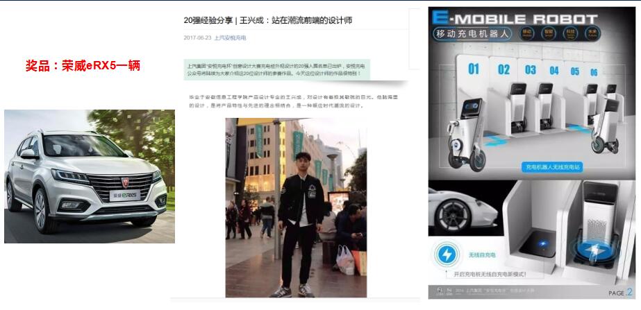 专业学生在上汽集团“安悦充电杯”创意设计大赛中成功入选,作品被采用奖品:荣威eRX5一辆;设计界的奥斯卡——红点概念设计奖获奖1项。