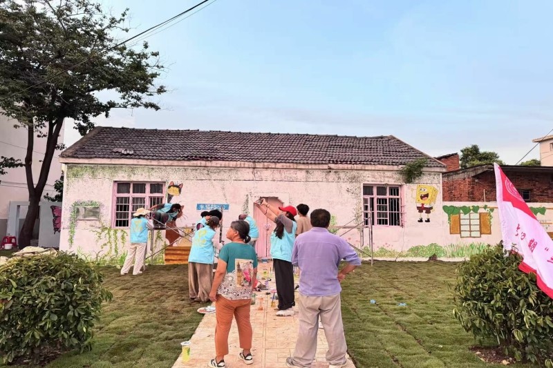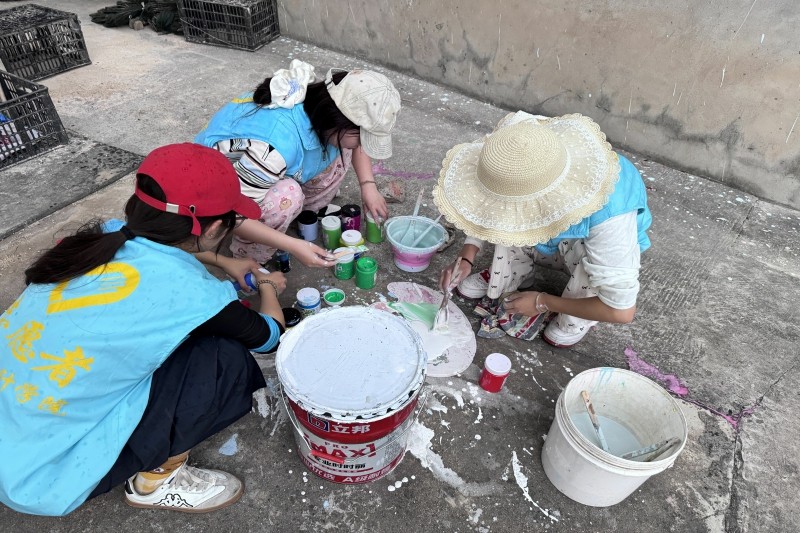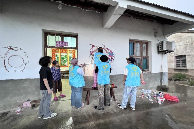 夏日的乡村骄阳似火,却挡不住队员们的热情。每天清晨,大家便带着颜料、画笔来到绘制点,从墙面打磨、构图起稿到调色晕染、细节完善,分工明确又相互协作。面对老旧墙面的斑驳痕迹,他们用腻子反复修补找平;面对阴雨天气等突发情况队员们没有退缩,及时调整方案,用耐心和细心攻克难题。