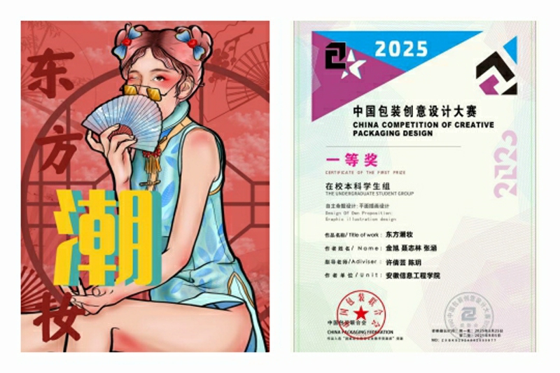 中国包装创意设计大赛由中国包装联合会主办,是行业内权威性高、影响力广的专业赛事。本届大赛竞争激烈,评选标准严格,获奖比例较低:一等奖仅占1.07%,二等奖为2.36%,三等奖为9.23%,优秀奖为15.02%,综合获奖率不足28%,甄选难度可见一斑。在此次高水平的角逐中,安徽信息工程学院艺术设计学院的师生团队凭借出色的创意构思和扎实的专业技能,成功脱颖而出,首次参赛即获奖73项,其中金旭同学的平面插画设计《东方潮妆》在激烈的角逐中斩获一等奖。程欣然同学的非遗文化传播应用设计《“春节·中国韵”——喜迎2025年非遗春节视觉创意设计》同样荣获一等奖(更多获奖名单参考附件:获奖名单-中国包装创意设计大赛)。取得如此成绩不仅实现了参赛的“开门红”,体现了学院师生出色的创意能力和专业水平。更是在全国舞台上打响了安徽信息工程学院的名声。