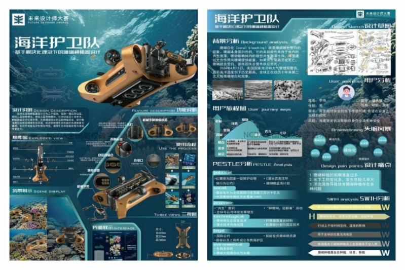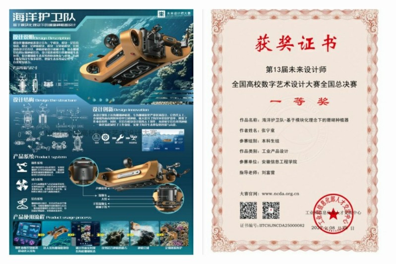 全国高校数字艺术设计大赛(NCDA)是由工信部人才交流中心主办,教育部中国高等教育学会认定,12个省教育厅发文立项,“学习强国”学习平台支持的国家级大学生竞赛。大赛始于2012年,每年举办一届,已连续举办十届,是高校积极参与的重要竞赛之一。每年有1000所高校参赛、100万人次以及来自50个国家/地区的参赛者参与其中。按照不同竞赛组别分别设奖,全国赛非命题赛道获奖难度较大,按照晋级全国赛作品总数的比例设一、二、三等奖,分别不高于5%、7%、9%。在此次国赛高水平的评比中,安徽信息工程学院艺术设计学院的师生团队凭借出色的创意和精湛的专业能力,一举夺得多个奖项,展现了当代学子的艺术才华与创新能力,其中张宇童同学的装备产品与出行工具作品《海洋护卫队-基于模块化理念下的珊瑚种植器》在激烈的角逐中斩获国赛一等奖。黄健宇、郑婧同学的信息可视化设计《中国古代自然科学发展信息可视化》荣获国赛二等奖等等。