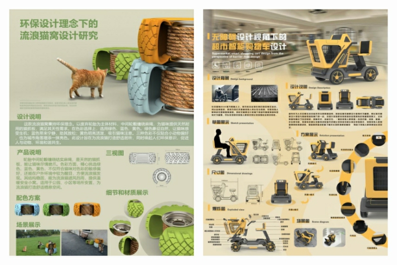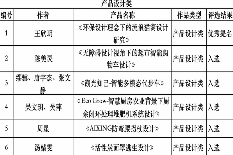 艺术设计学院积极组织学生参展,六个作品成功入选,其中王欣玥同学的作品《环保设计理念下的流浪猫窝设计研究》荣获产品设计类优秀提名奖,陈美灵同学的作品《无障碍设计视角下的超市智能购物车设计》、缪骥、唐宇杰、张文静同学的作品《溯光知己-智能多模态代步车》、吴文玥、吴萍同学的作品《Eco Grow-智慧厨房农业背景下厨余闭环处理堆肥机系统设计》、周星同学的作品《AIXING防弯腰拐杖设计》、汤婧雯同学的作品《活性炭面罩逃生设计》获入选奖。