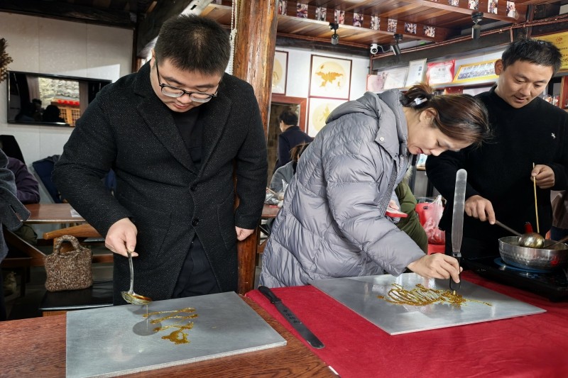 下午,非遗体验课堂开课。非遗糖画传承人王老师以铜勺为笔、糖浆作墨,三分钟勾勒“红船”轮廓。教师们把专业所学融入指尖,在王老师的指导下完成“党徽”“天安门”糖画和“红军”“祥龙”等图案,让传统手艺焕发年轻表情,作品可带走,记忆却留下。